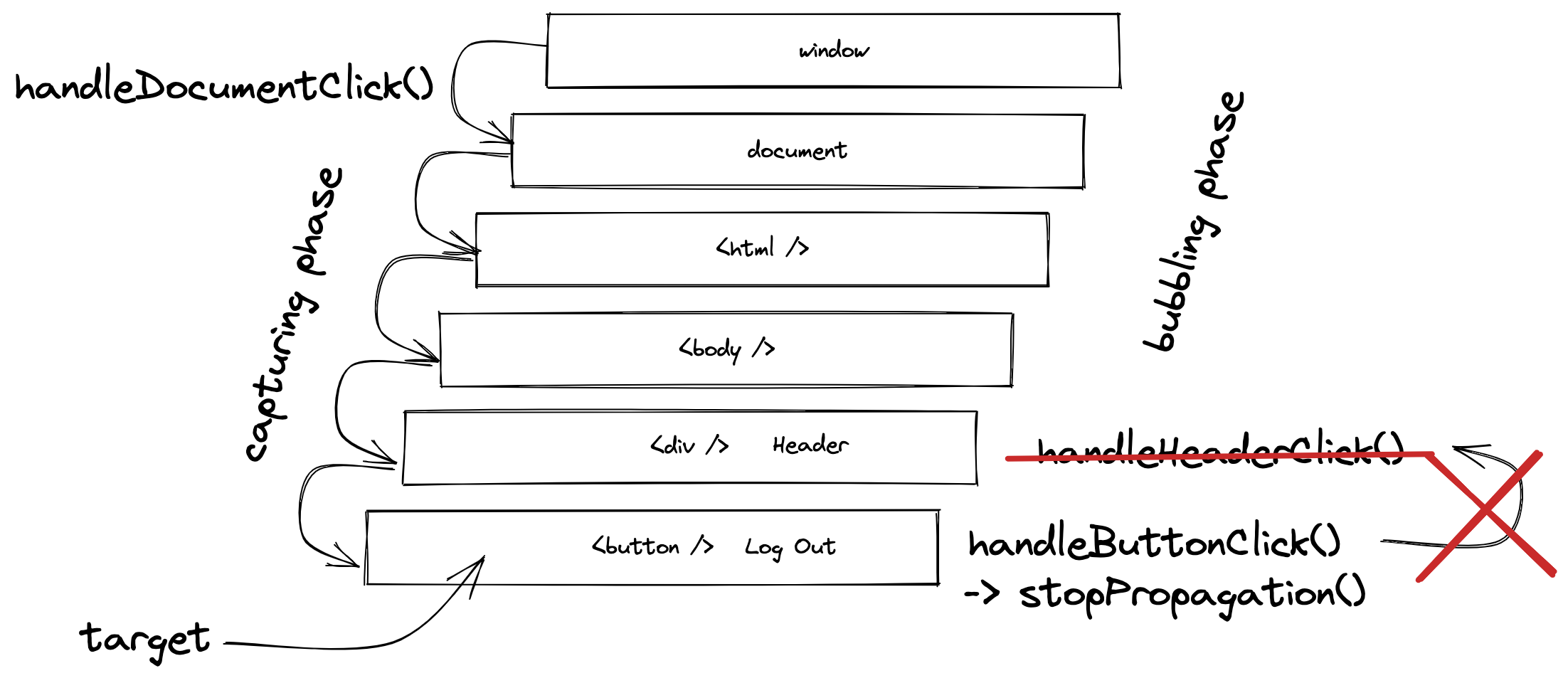 }When the log out button gets clicked, the capturing phase runs through all handlers from top to bottom, thus triggering the handler on the document level for the analytical tracking. Then it traverses down the elements to the target (here: button), because no other event handlers are listening to the capturing phase (e.g. by using onClickCapture instead). From there, the event bubbles up and triggers the button’s event handler which stops the event from propagating to the header’s event handler.
