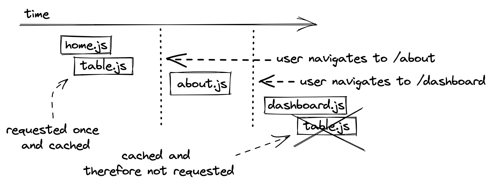 However, as you can see this leads to redundant code that’s requested from the web server. The same happens when a user navigates to a code split route twice, because it would get loaded from the web server twice as well. Hence we want the browser to cache (read: store in the browser’s cache on the user’s machine) the result.