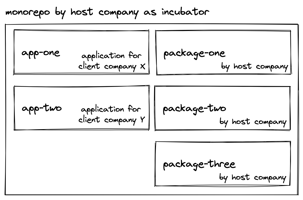 Incubating: When on-boarding a new client to the monorepo, we/they create a repository via git from where we clone it into our monorepo. From there, we can opt-in shared packages from the monorepo as dependencies. The client can clone the repository any time as standalone project (without having to rely on the monorepo) while being able to install all dependencies from the registry, because of the mandatory versioning of the shared packages.