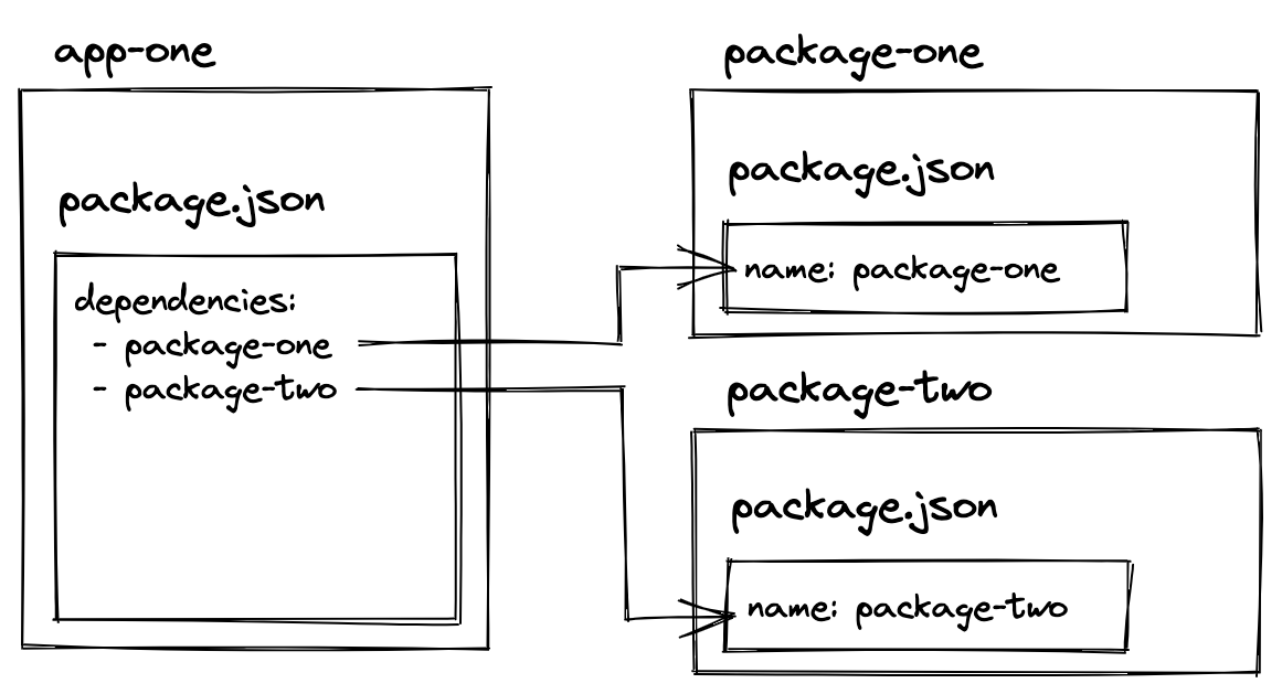 Now, if an application from apps wants to include a package from packages, it just has to use the name property from the package’s package.json file as dependency in its own package.json file (as we have seen before).