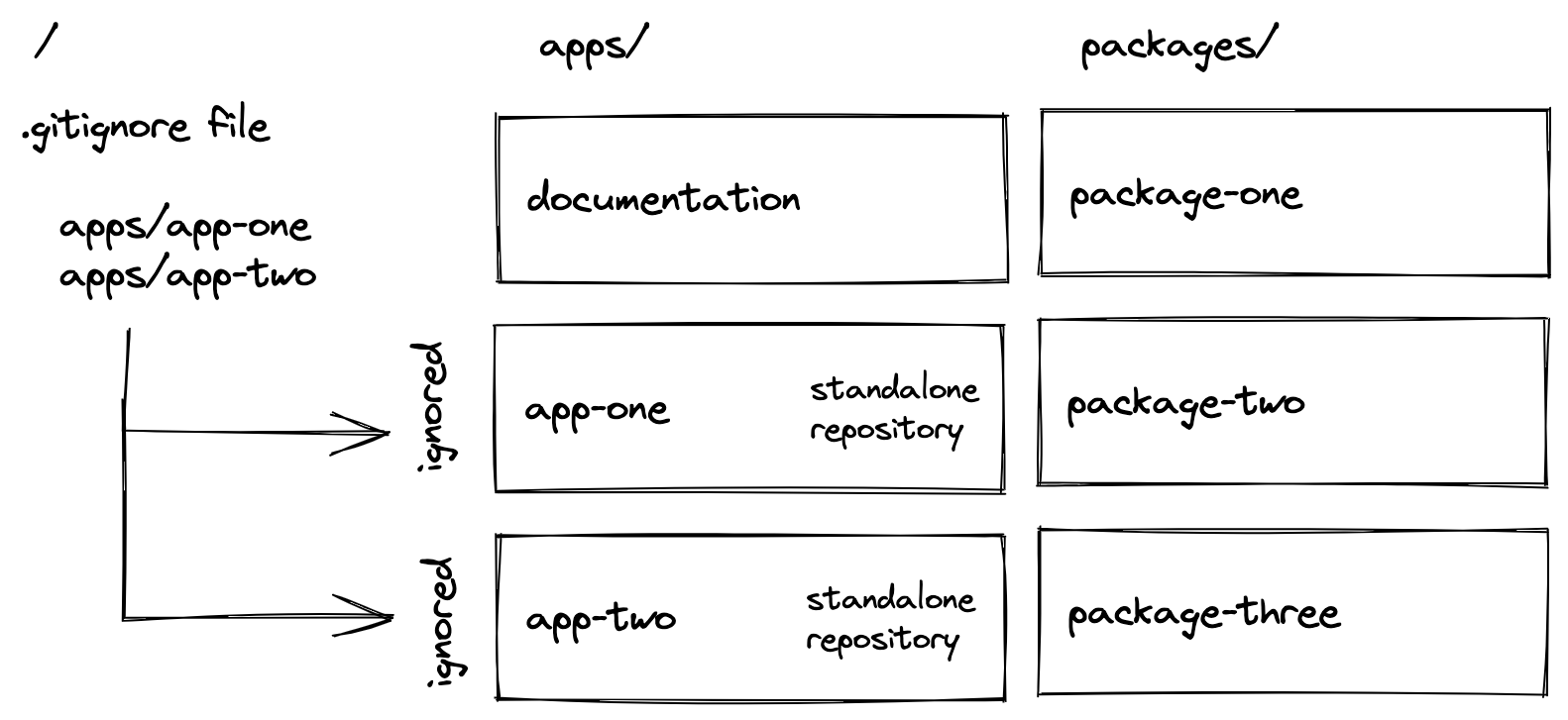There may be various ways to move from a single Git repository to multiple Git repositories for a monorepo — essentially creating a polyrepo in disguise as a monorepo. In our case, we just used a top-level .gitignore file which ignores two of the nested workspaces from the apps which should have their dedicated Git repository.