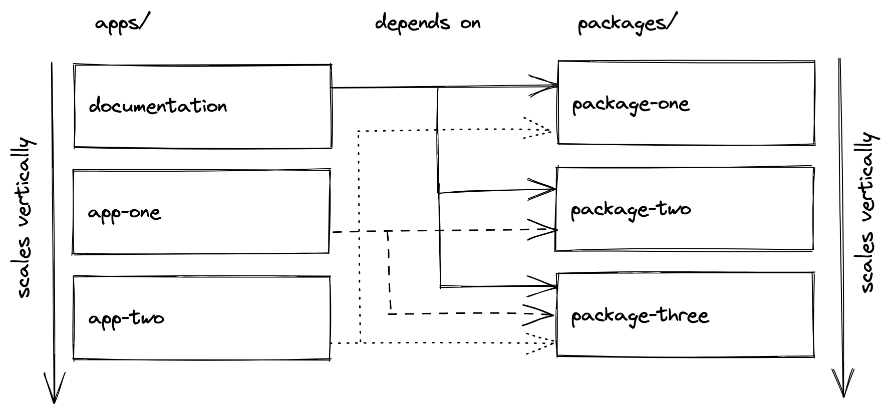 A monorepo can contain multiple applications (here: apps) whereas each application has access to shared set of packages. Bear in mind that this is already an opinionated monorepo structure, but it’s a common one if you get started with monorepos: