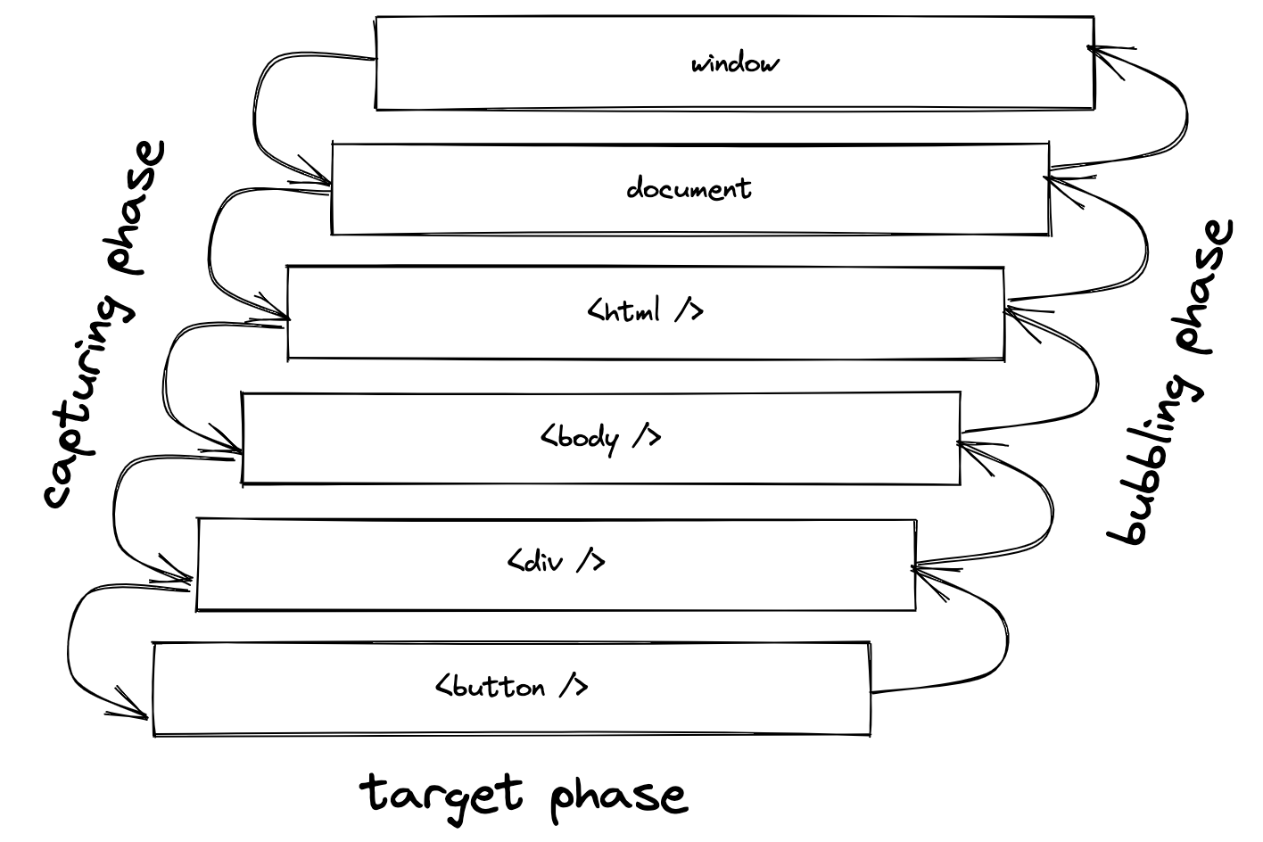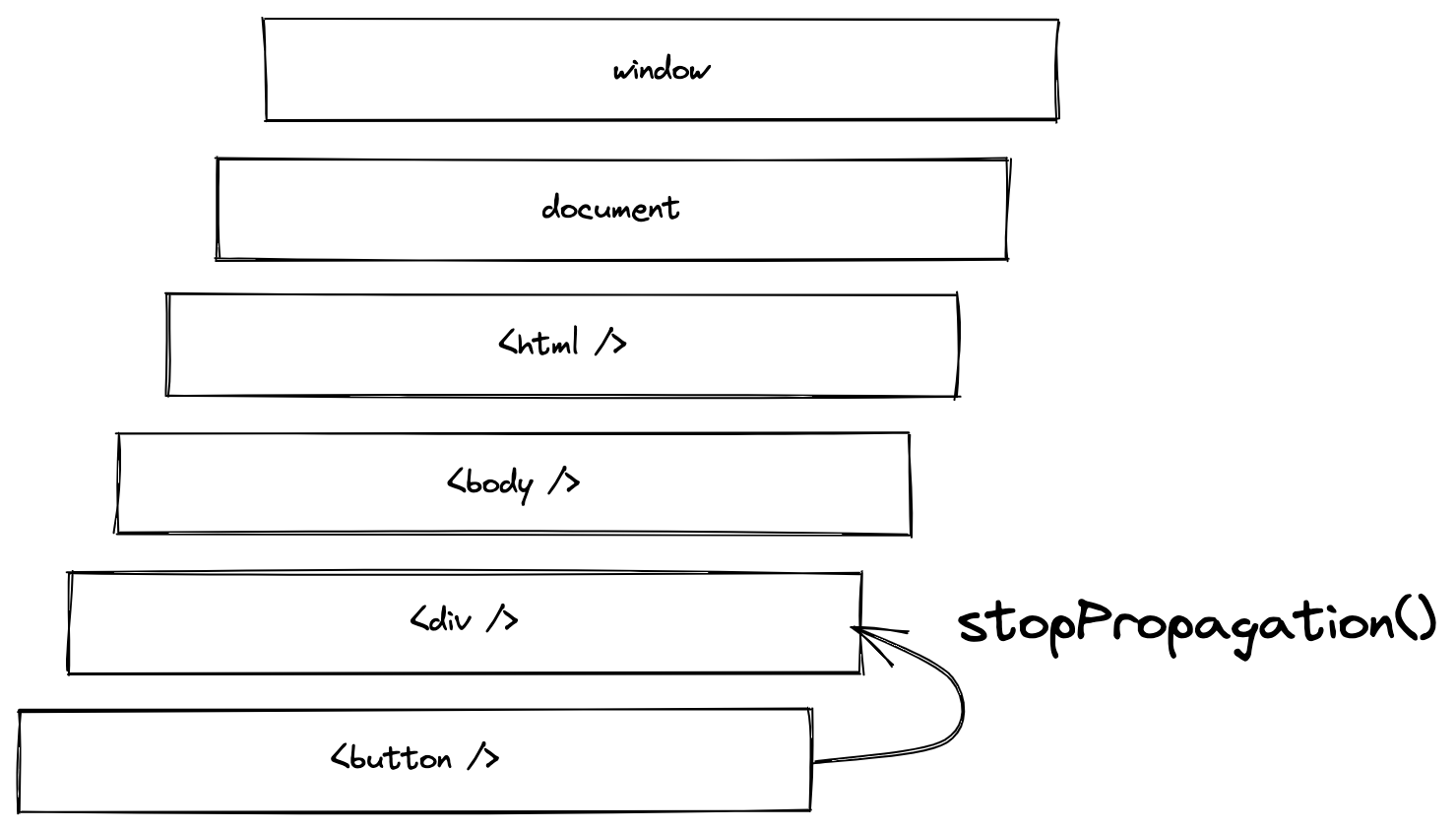 }When the log out button gets clicked, the capturing phase runs through all handlers from top to bottom, thus triggering the handler on the document level for the analytical tracking. Then it traverses down the elements to the target (here: button), because no other event handlers are listening to the capturing phase (e.g. by using onClickCapture instead). From there, the event bubbles up and triggers the button’s event handler which stops the event from propagating to the header’s event handler.