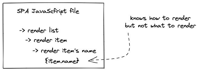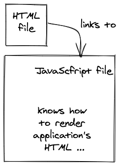 In contrast, a single-page application encapsulates the entire application in mostly JavaScript which has all the knowledge about how and what to render with HTML (and CSS) inside it. For the most basic usage of a single-page application, the browser would request only once a HTML file with one linked JavaScript file for a domain.