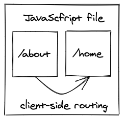 With the usage of a traditional SPAs, we also moved from server-side routing to client-side routing. The initially requested JavaScript file for the basic SPA has all the pages of a website encapsulated. Navigating from one page (e.g. /about) to another page (e.g. /home) wouldn’t perform any request to the web server. Instead, a client-side router (e.g. React Router for React) takes over to render the appropriate page from the initially requested JavaScript file.