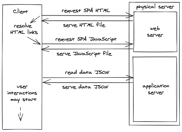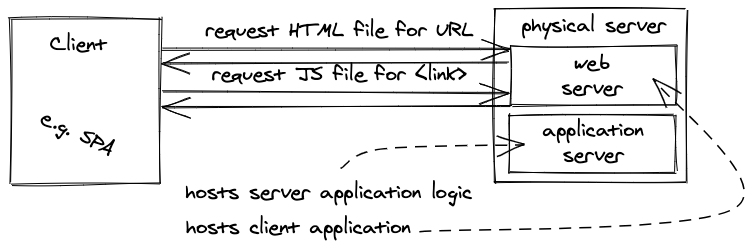 Because of this change from server to client execution of the rendering, we call it client-side rendering now. In other words: Instead of serving the pre-rendered HTML directly from the web server, we serve mainly JavaScript from the web server which executes on the client and only then renders the HTML. Often the term SPA can be used synonymously with the term client-side rendered application.