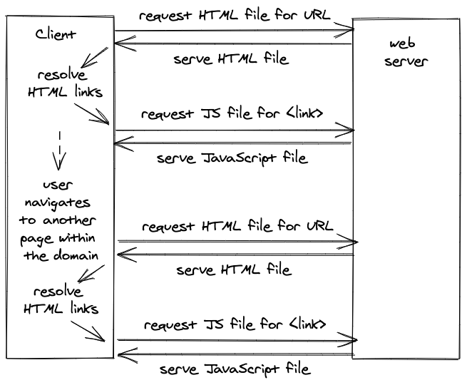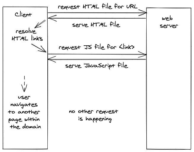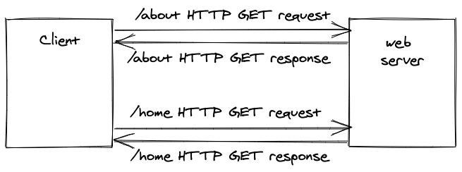 What happens when I visit a website at a URL and navigate around this domain (e.g. mywebsite.com) from a path (e.g. /about) to another path (/home)? For a traditional website, a new request is made by a client to a web server for every distinct URL.