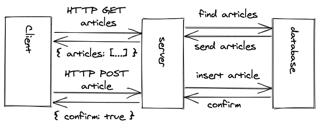 Essentially there are two roundtrips of requests when dealing with client-side rendered applications: one for the JavaScript application and one for the data to fill in the blanks. Once everything is rendered in the browser, a user starts to interact with the application — for instance by creating a new blog post. JSON is a preferred format to send data from client to server and vice versa. The server deals with all the requests from the client by reading from or writing to the database; which can be on the same physical server, but doesn’t need to be (e.g. just sitting on another physical server).