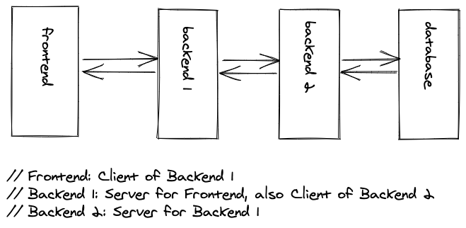 But, in contrast, the terms client and server are a matter of perspective. A backend application (Backend 1) which consumes another backend application (Backend 2) becomes a client application (Backend 1) for the server application (Backend 2). However, the same backend application (Backend 1) is still the server for another client application which is the frontend application (Frontend).
