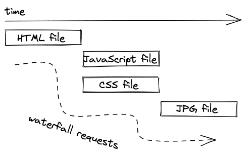 These are also called waterfall requests, because one request has to wait for another request to finish. In our example, the browser doesn’t know that it needs to request the CSS file before the HTML file arrives with the HTML link tag. And in the next example the HTML file links to a JavaScript and CSS file, whereas the CSS file links to a JPG file (which may be used as CSS background for example).